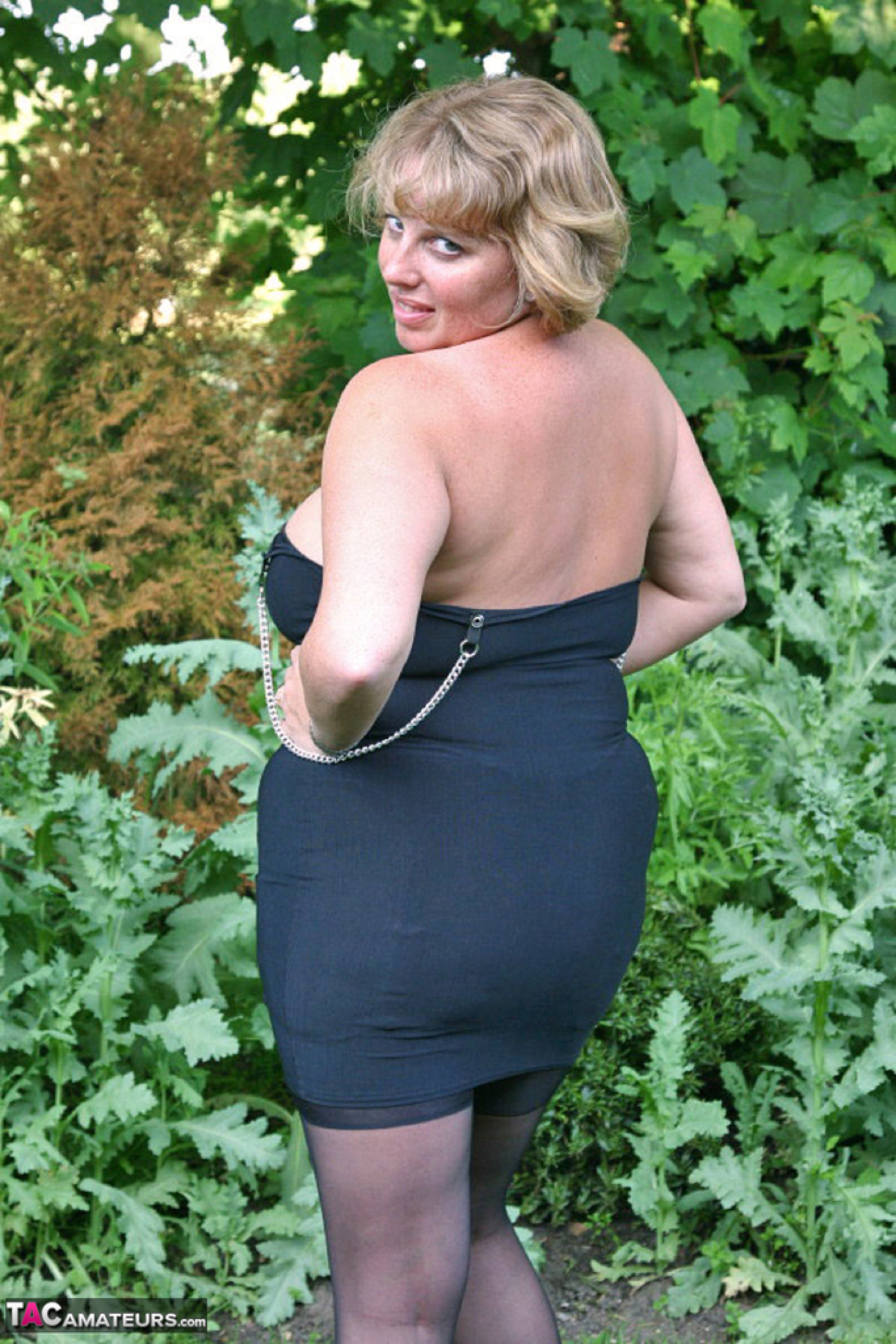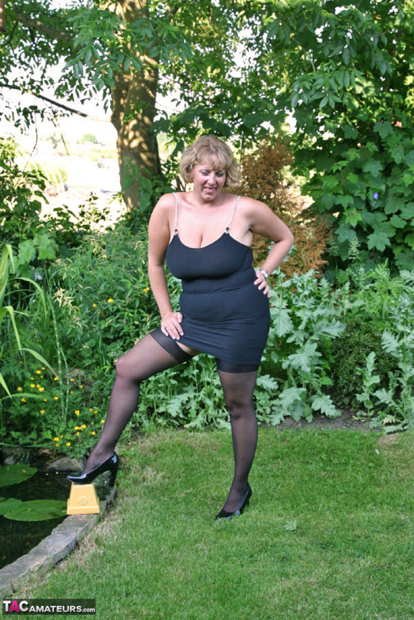 Fat older woman Curvy Claire sets her giant boobs loose in backyard